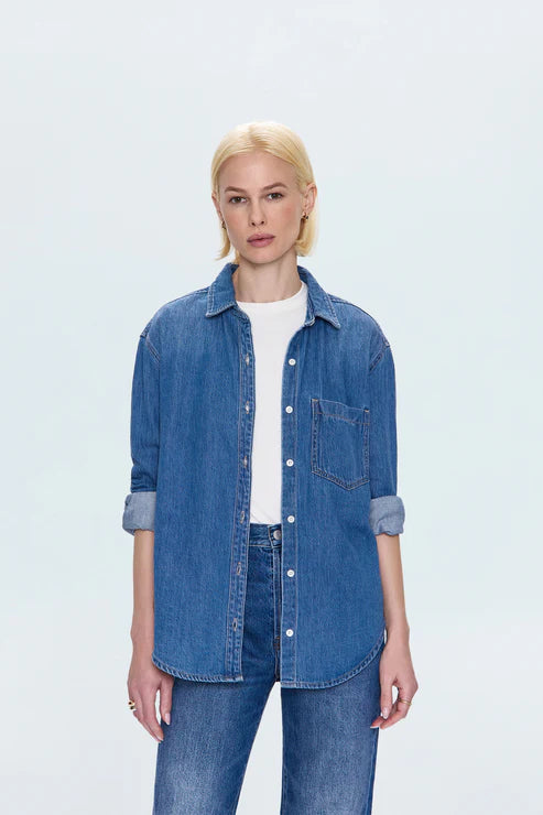 The denim shirt you'll reach for again and again. Jaime delivers essential styling with a relaxed fit and classic button-up design, finished with a 27 1/2" front length that hits at just the right spot. The timeless silhouette features a chest pocket and clean finishing that feels both polished and effortless. Crafted from rigid denim in Agenda, a medium blue wash.