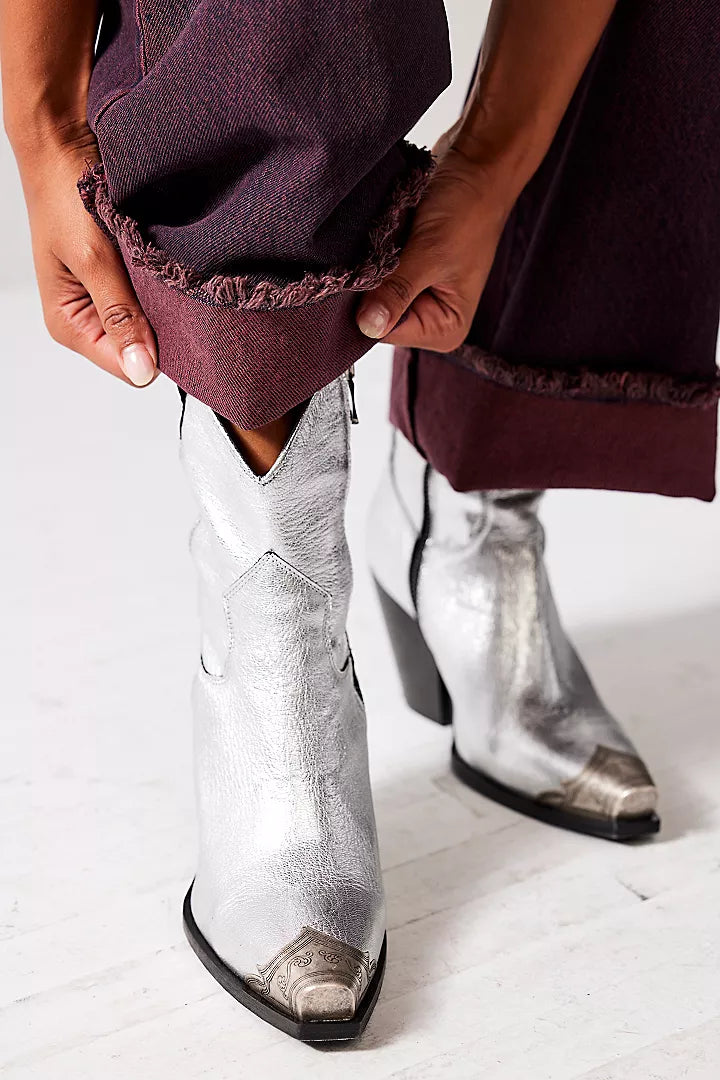 Gorgeous Italian-crafted leather boots featured in a western-inspired style with an etched metal toe, slim sit and stacked heel.