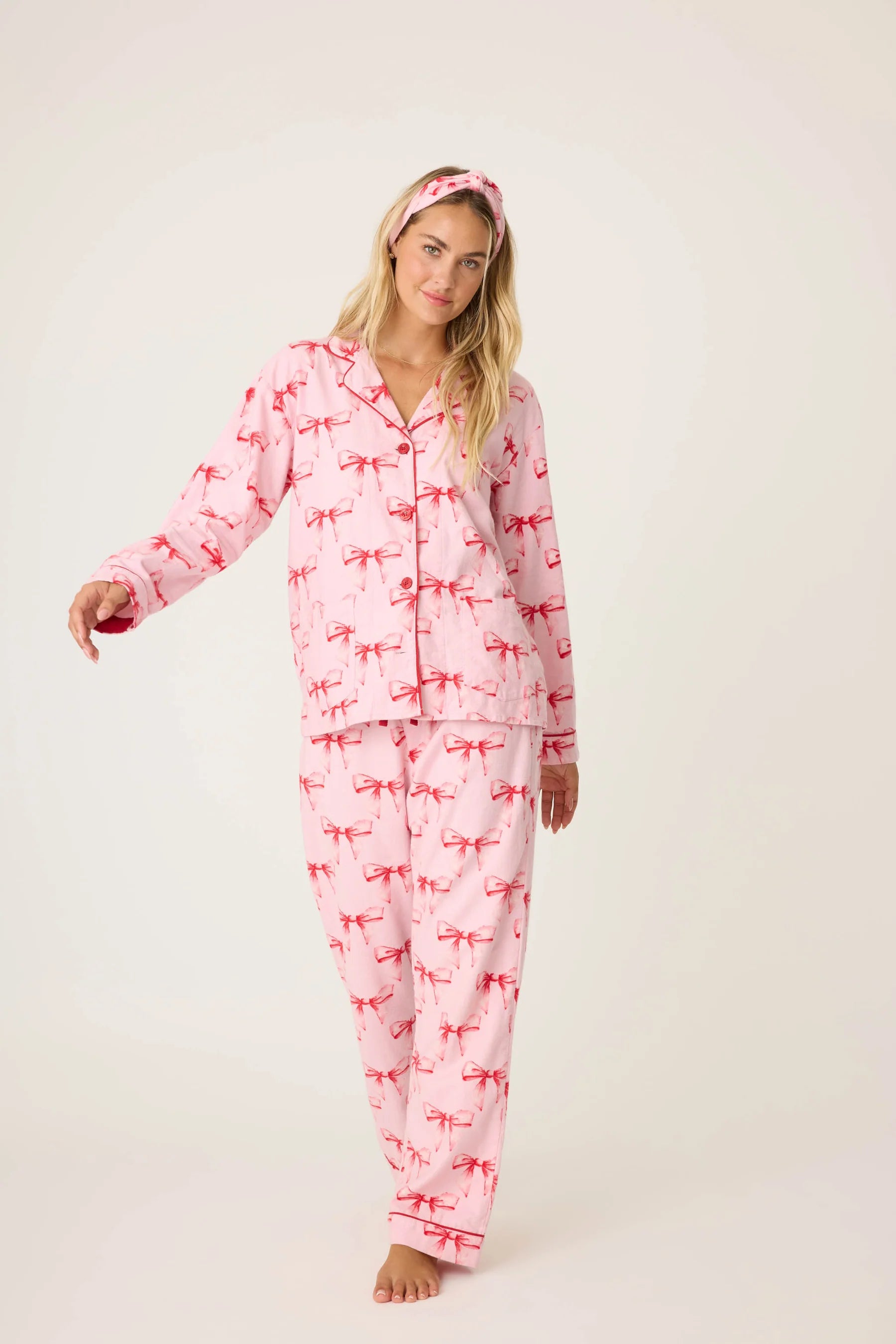 Perfectly tied, perfectly cozy! Indulge in comfort with this charming pink PJ set, featuring a relaxed fit top and tie waist pants adorned with a delicate pink bow pattern. The cute pink bow motifs add a touch of playful elegance, making this set as stylish as it is comfortable. Perfect for lounging or sleeping, this pajama set combines feminine charm with ultimate relaxation, making it an essential addition to your collection or the perfect gift.
