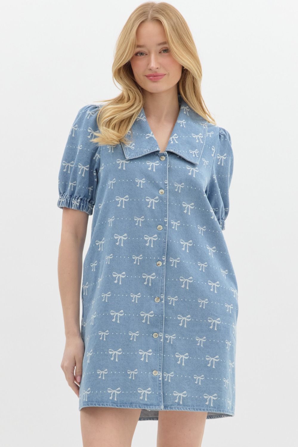 Bow pattern short puff sleeve mini shirt dress featuring front button closure below chelsea collar. Pockets at side. Unlined. Woven. Non-sheer. Lightweight.