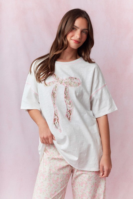 FLORAL PRINTED LACE LASER CUT OVERSIZED T-SHIRT WITH BOW