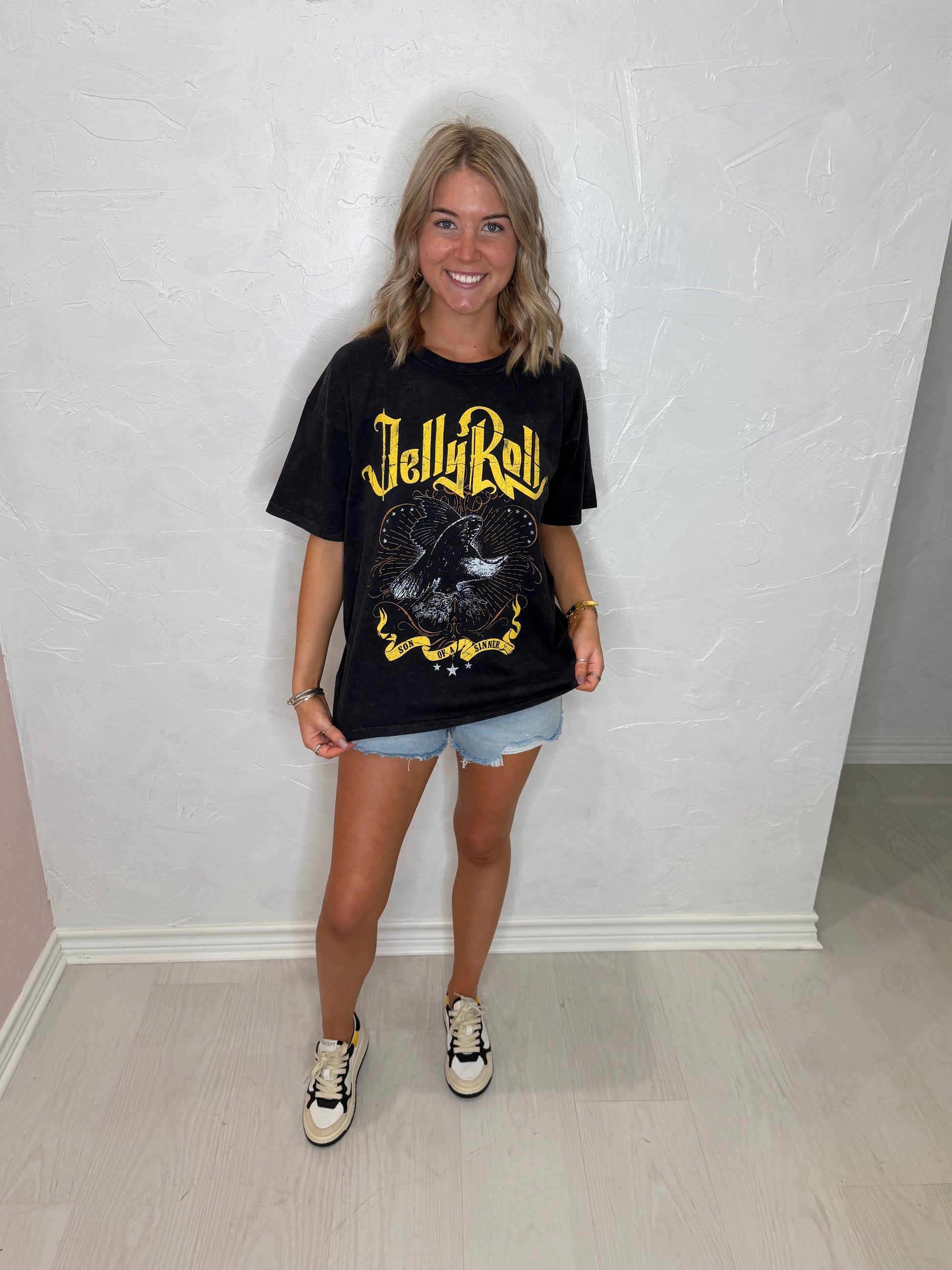Hold onto your hats - festival headliner Jelly Roll just landed on our roster. Give it up for the country-rap sensation taking over the music scene with heartfelt storytelling. The star's top track "Son of a Sinner" lands in an eagle graphic on thiS tee featuring its corresponding album name on the back.