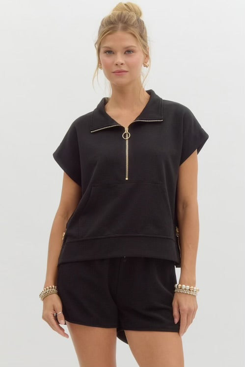 Solid rib texture short sleeve half zip top featuring kangaroo pocket at front. Zip up detail at side hem. Unlined. Knit. Non-sheer. Lightweight.