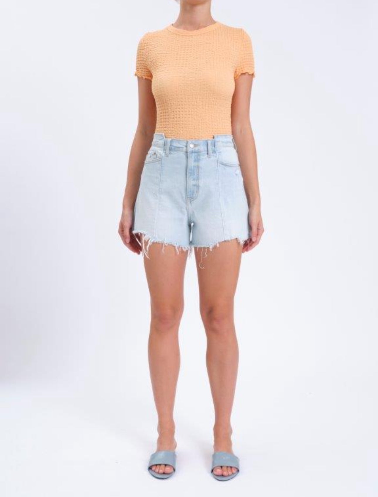 CUT OFF SHORTS WITH LINES AND CUT OUTS AT HIPS IN LOST LOVE COLOR.