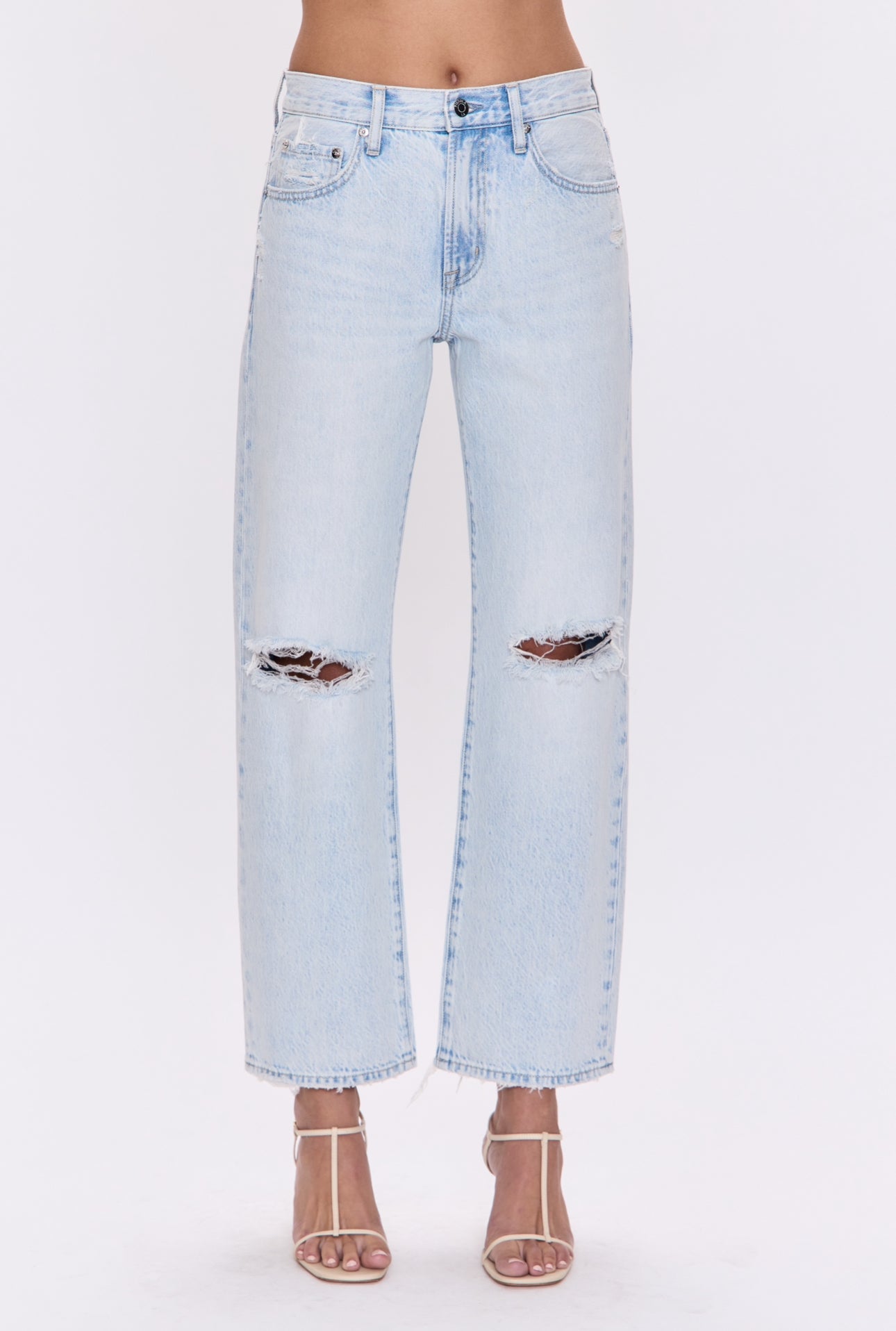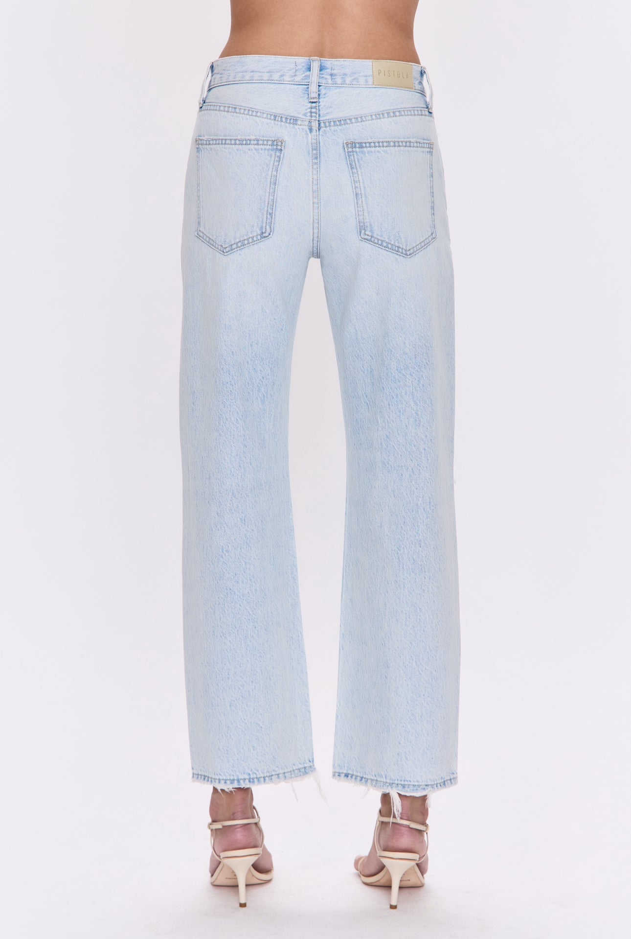 Mid-rise, with a straight leg that bows at the knees for an arched, barrel leg silhouette. Ankle length crop with a clean hem.