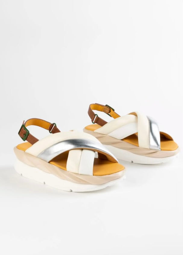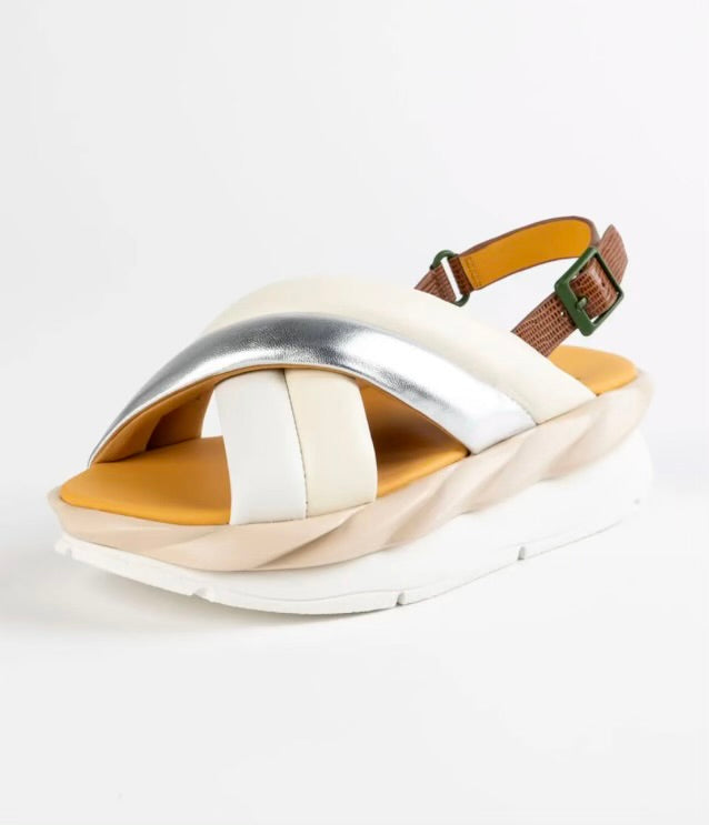 Sheep leather, Slip-on style, slingback style, puffy leather criss-cross straps, round open toe, adjustable snake print strap, double-layer platform EVA sole