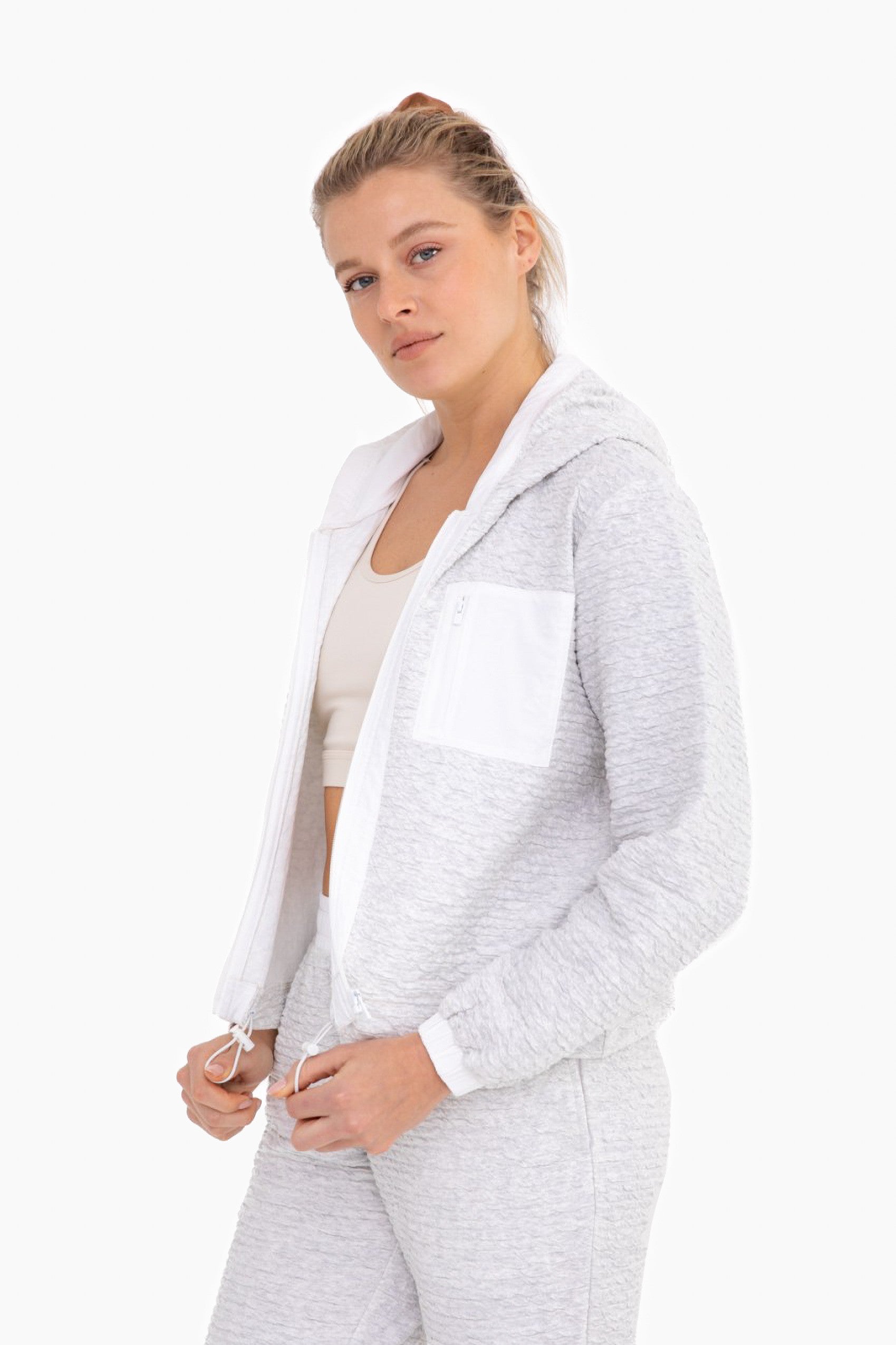 Lightweight and breathable, this textured zip-up jacket is perfect for every busy lifestyle. It features a contrast fabric zippered chest pocket, a full front zip, elastic wrist cuffs, and bungee toggles along the hem for an adjustable fit.