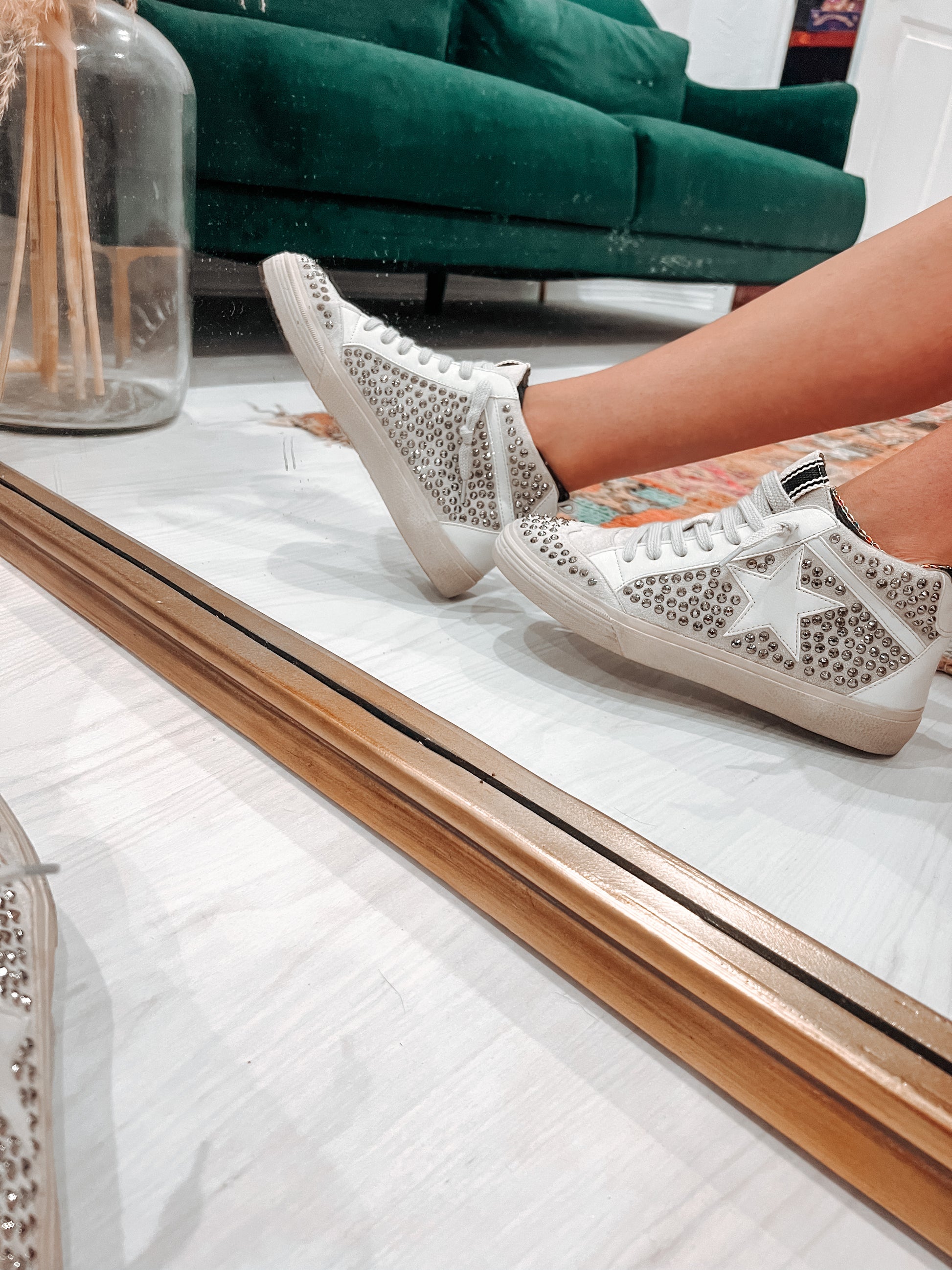 This modern sneaker is made from breathable materials with a classic hightop design. Featuring an eye-catching studded pattern and durable rubber sole, these shoes are perfect for everyday wear.