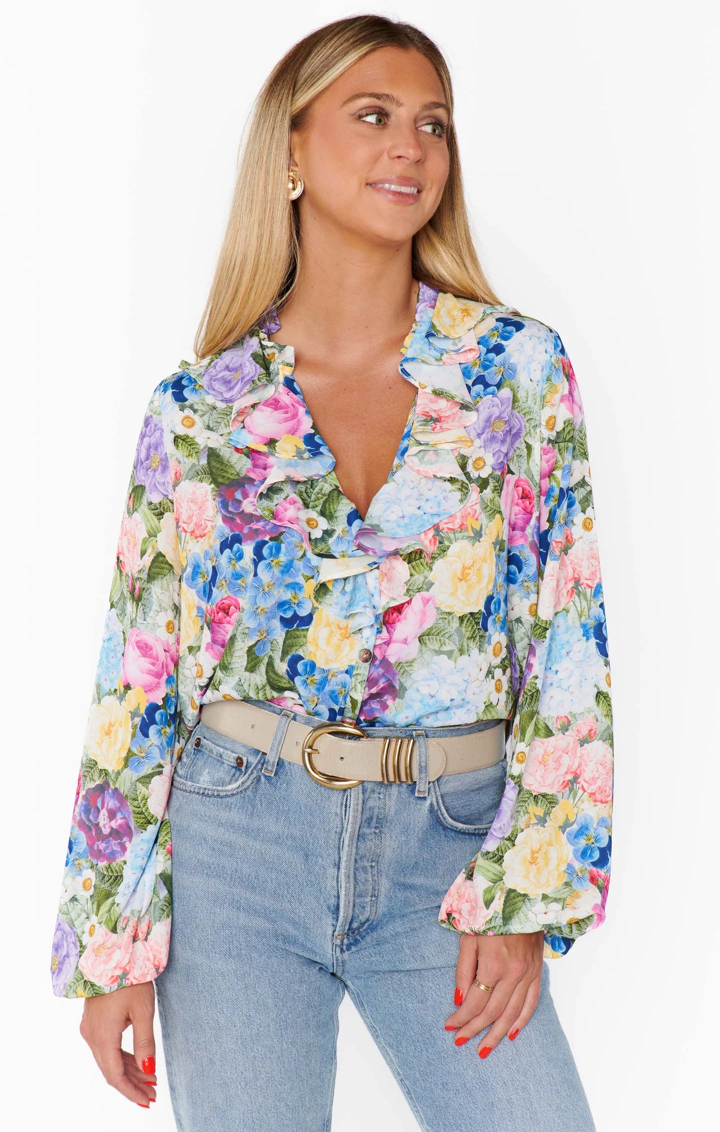 The Suki Ruffle Top is a timeless classic with a playful twist! This floral button down is all about the details, featuring a relaxed silhouette and ruffled collar for a whimsical charm. Style this versatile blouse tucked into jeans or let it flow for a carefree 'fit.