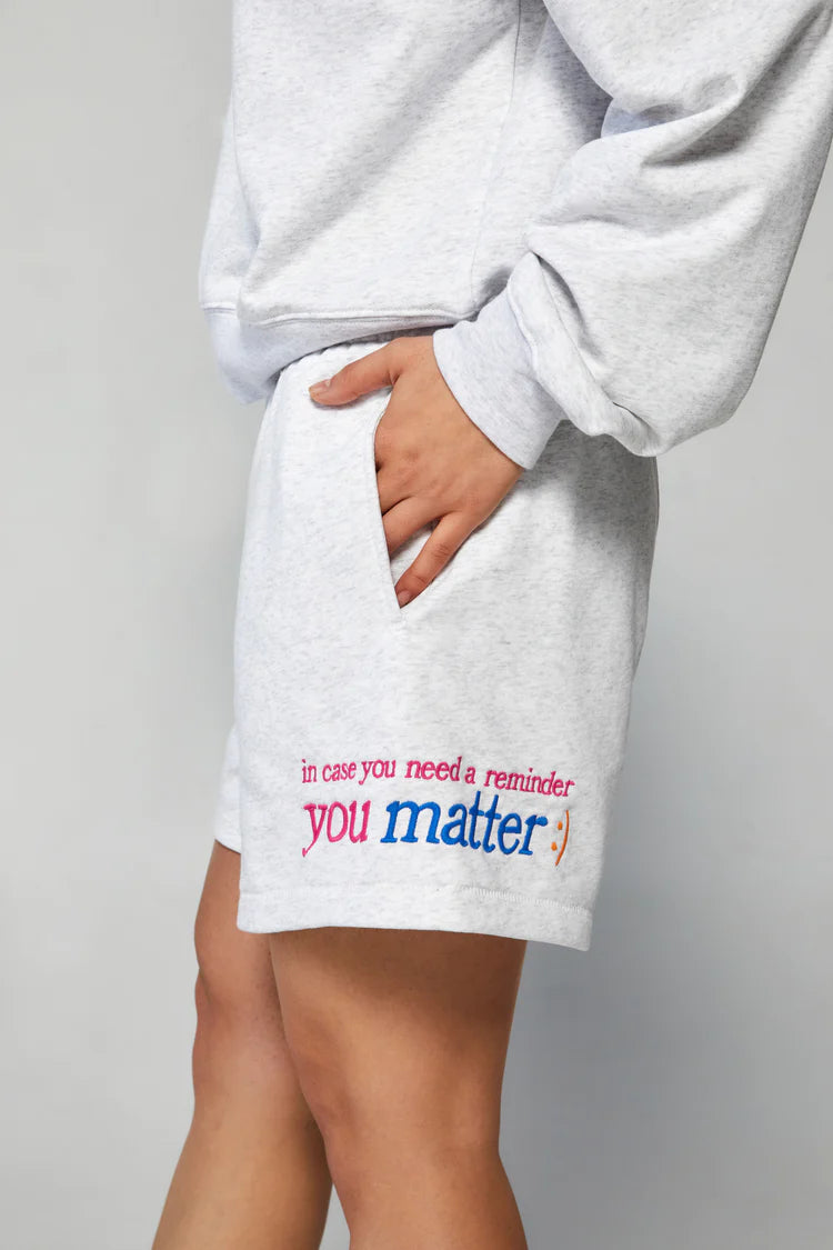 - 'you matter :)' embroidered in pink, blue, and orange on left thigh